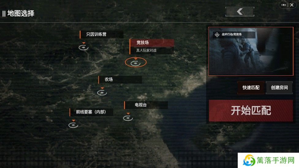 3. 在选择“竞技场”地图后,同样可以选择快速匹配或创建房间,根据自己的需求进行选择,最后点击开始游戏即可联机。